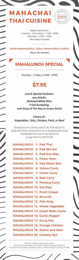 Discover a vibrant array of Thai flavors at Mahachai Thai Cuisine, located in Moreno Valley. Their menu offers an impressive selection of traditional dishes made with fresh ingredients and a variety of proteins, including fantastic vegan options to satisfy any dietary preference. Highlights include the Asparagus Shrimp Stir Fry featuring succulent shrimp in a special Thai sauce, and the addictive Pad See Ew, stir-fried to perfection with a rich soy sauce.